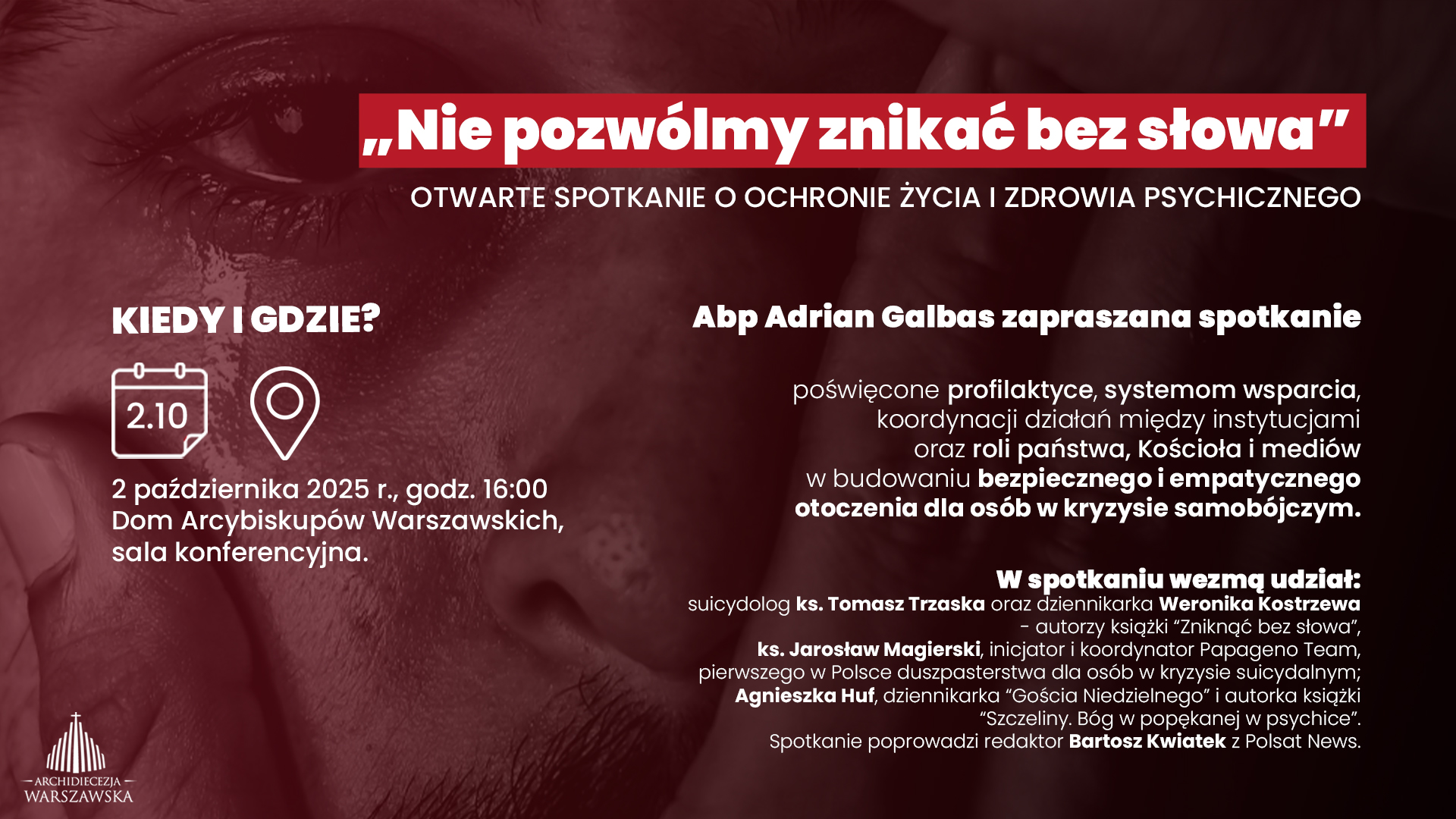 Abp Adrian Galbas zaprasza na otwarte spotkanie “Nie pozwólmy znikać bez słowa”, które odbędzie się w czwartek 2 października w sali konferencyjnej Domu Arcybiskupów Warszawskich