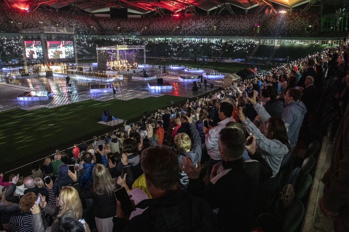 "Jezus na Stadionie Legii" to ośmiogodzinne rekolekcje, które odbyły się w wigilię Zesłania Ducha Świętego pod hasłem "Świat rani, Bóg leczy". O północy Mszy Świętej przewodniczył metropolita warszawski abp Adrian Galbas