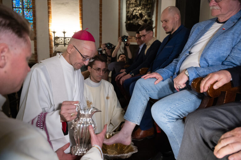 – Zanim Chrystus pójdzie na krzyż, aby się ofiarować całkowicie i umrzeć z miłości, teraz podczas Ostatniej Wieczerzy, daje uczniom wymowny przykład konkretnej miłości. Wstaje od stołu, przepasuje się prześcieradłem i obmywa im nogi. To jest gest szalony! W rodzinach żydowskich nogi obmywał ostatni z niewolników, a jak rodzina była biedna i nie stać jej było na zatrudnienie niewolnika, to nogi obmywał najmłodszy syn. I oto teraz, Ten, któremu Ojciec dał wszystko, a któremu Jan Chrzciciel nie był godzien schylić się i rozwiązać rzemyka u sandałów (por. Łk 3,16), sam się schyla i robi coś więcej: myje nogi. I może dlatego Judasz zgodził się, by za Chrystusa dano mu trzydzieści srebrników, czyli tyle ile za niewolnika, skoro widział Chrystusa, który dobrowolnie wypełnia niewolnicze powinności – mówił abp Galbas.