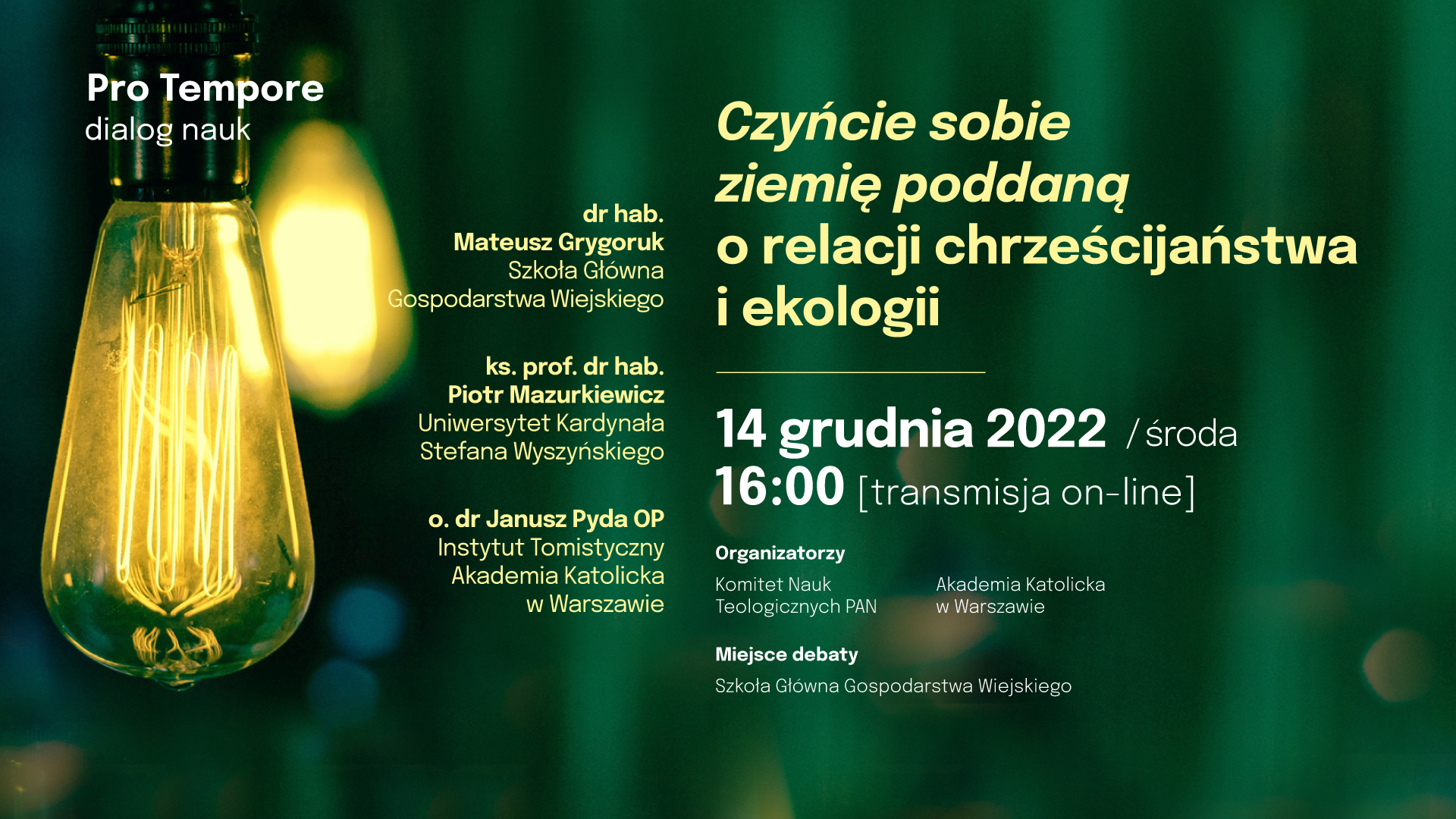 To zagadnienia, które omówią goście debaty pt. „Czyńcie sobie ziemię poddaną. O relacji chrześcijaństwa i ekologii”. W spotkaniu wezmą udział dr hab. Mateusz Grygoruk, profesor Szkoły Głównej Gospodarstwa Wiejskiego, ks. prof. dr hab. Piotr Mazurkiewicz z Uniwersytetu Kardynała Stefana Wyszyńskiego oraz  dr Janusz Pyda OP, Instytut Tomistyczny i Akademia Katolicka w Warszawie.