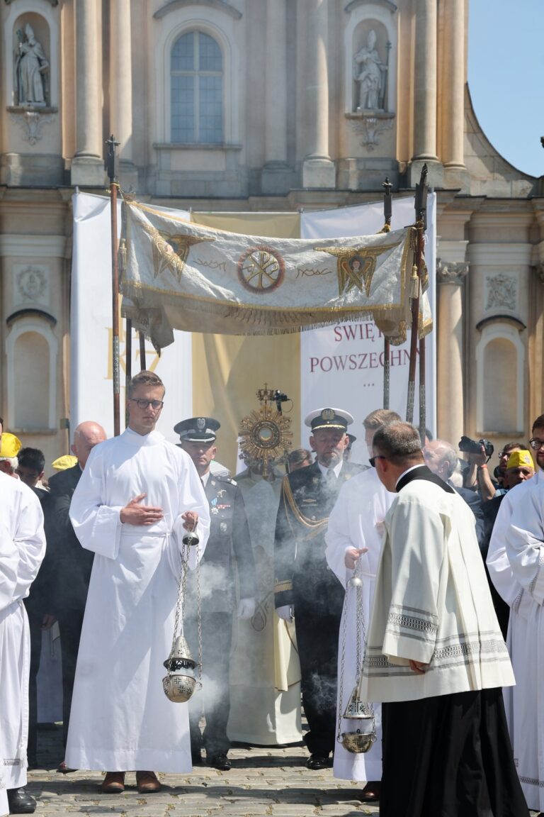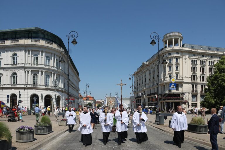 Zakończyła się centralna procesja @ArchWarszawska. Najświętszy Sakrament w zabytkowej monstrancji z bazyliki Świętego Krzyża do czterech ołtarzy nieśli bp Piotr Jarecki, bp Rafał Markowski, bp Tadeusz Pikus i bp Wiesław Lechowicz. pic.twitter.com/yO88fZpiMf