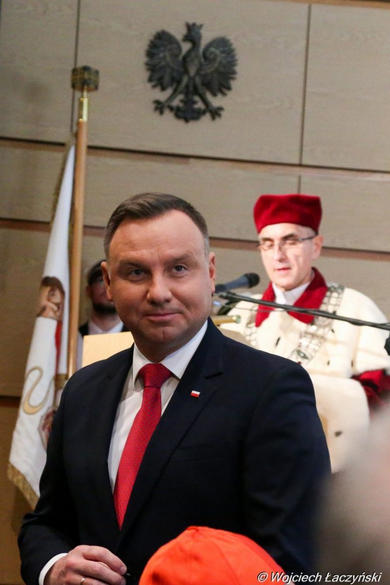 „Jesteście Państwo – mówił prezydent RP -prawdziwym uniwersytetem, na którym wolność znaczy wolność, a szacunek znaczy szacunek. To są właśnie te wartości, które macie zapisane w statucie i te wartości są tutaj przestrzegane. Gratuluję nowych wydziałów, rozwijających się kierunków, z których aż jedenaście znalazło się w pierwszej dziesiątce rankingu Perspektyw w 2019 roku. Gratuluję wszystkich osiągnięć, możliwości nadawania stopnia doktora aż w 13 dziedzinach, gratuluję możliwości nadawania stopnia doktora habilitowanego w 10 dziedzinach. Gratuluję rozwoju Uniwersytetu – powiedział Prezydent RP.