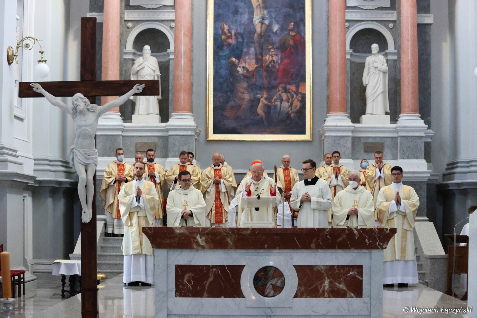 Na podstawie przedwojennych zdjęć, specjalistycznych badań i historycznych konsultacji odtworzony został m.in. ołtarz główny z obrazem włoskiego malarza Francesco Trevisaniego „Ukrzyżowanie”. W świątyni przywrócono także wiele dzieł sztuki – rzeźb i obrazów. Przedwojenną kolorystykę zyskały m.in. boczne ołtarze, a posadzka, choć nowa, nawiązuje swoim wyglądem do znajdującej się w renesansowej bazylice św. Justyny w Padwie, która jest prototypem śródmiejskiej świątyni.