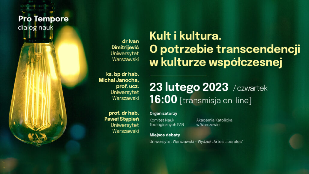 O tym porozmawiają goście debaty z cyklu „Pro tempore – dialog nauk” pt. „Kult i kultura. O potrzebie transcendencji w kulturze współczesnej”. W spotkaniu wezmą udział badacze z Wydziału „Artes Liberales” Uniwersytetu Warszawskiego: dr Ivan Dimitrijević, filozof; bp dr hab. Michał Janocha; prof. ucz., historyk sztuki, oraz prof. dr hab. Paweł Stępień, literaturoznawca.