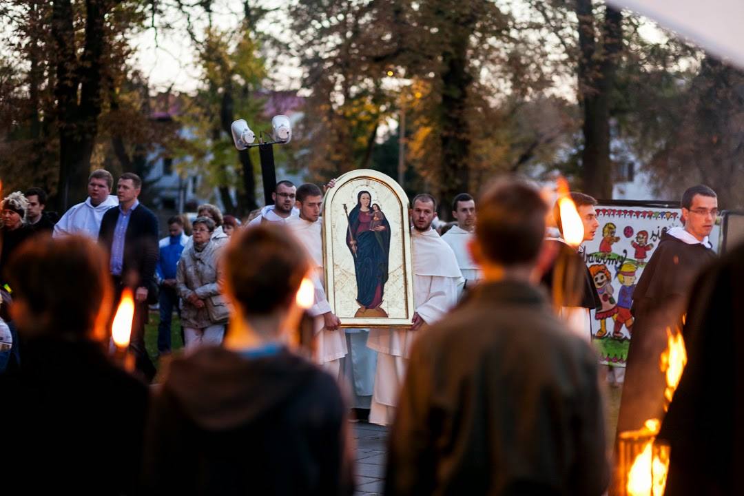 VI Warszawski Dzień Modlitwy Różańcowej zakończył się procesją różańcową w blasku ognisk. Poprzedziła ją Msza św. W dialogowanej homilii o. Tomasz Nowak OP i Marek Rajszyk OP zwrócili uwagę, że Maryja, choć była matką, stała się uczennicą swojego Syna, tak pilną, że może być naszą nauczycielką. Kaznodzieje zachęcili, by wszystkie wydarzenia naszego życia, szczególnie te trudne przeżywać razem z Nią. – Pytajmy Maryję: „jak mam to przeżyć?”, a we wszystkich trudnych sytuacjach doświadczymy wewnętrznego pokoju, który płynie z wiary. W każdym czasie możemy być błogosławieni – mówili.