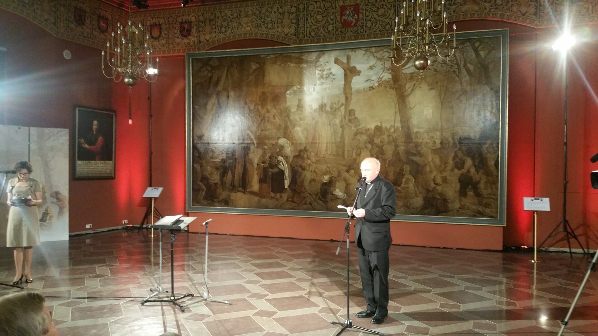 „Dziś, właśnie w ramach współpracy kulturalnej, możemy w sposób szczególny powrócić do lat końca XIV wieku i wyobrazić sobie rodzące się na Litwie chrześcijaństwo. Wydarzenie to w sposób mistrzowski ilustruje obraz wybitnego polskiego malarza Wojciecha Gersona „Chrzest Litwy”, pochodzący ze zbiorów Muzeum Kolekcji im. Jana Pawła II w Warszawie” – wskazywał na dzieło prezentowane w Pałacu Wielkich Książąt Litewskich kard. Nycz.