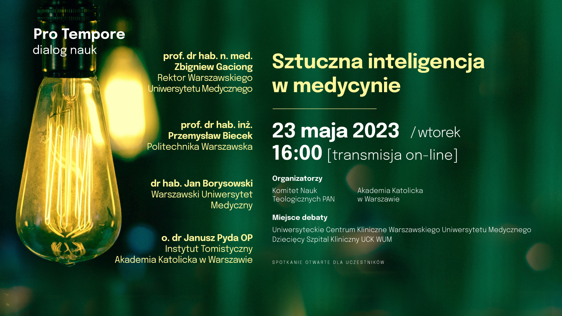 O wykorzystaniu sztucznej inteligencji w medycynie będą rozmawiać goście najbliższego spotkania z cyklu „Pro tempore. Dialog nauk”, które odbędzie się we wtorek, 23 maja, o godz. 16:00 w Dziecięcym Szpitalu Klinicznym UCK WUM (sala konferencyjna, poziom -1, ul. Żwirki i Wigury 63a).