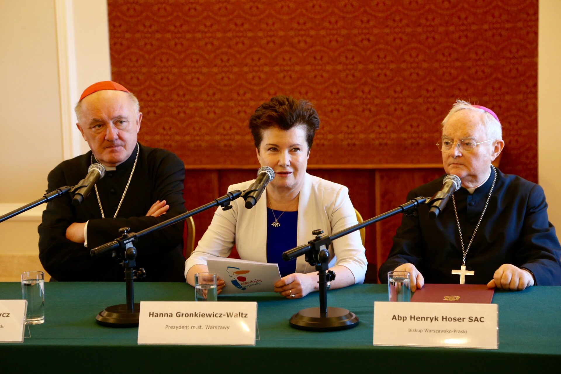 Kard. Kazimierz Nycz, abp Henryk Hoser i prezydent Warszawy Hanna Gronkiewicz-Waltz wzięli udział w konferencji prasowej dotyczącej stanu przygotowań do Dni w Diecezjach poprzedzających ŚDM.