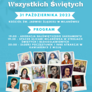 Wieczór Wszystkich Świętych rozpocznie się od adoracji o godz. 19:00. Następnie, o godz. 19:30 spacer ulicami Milanówka w strojach świętych i błogosławionych, a na zakończenie słodki poczęstunek w kawiarence