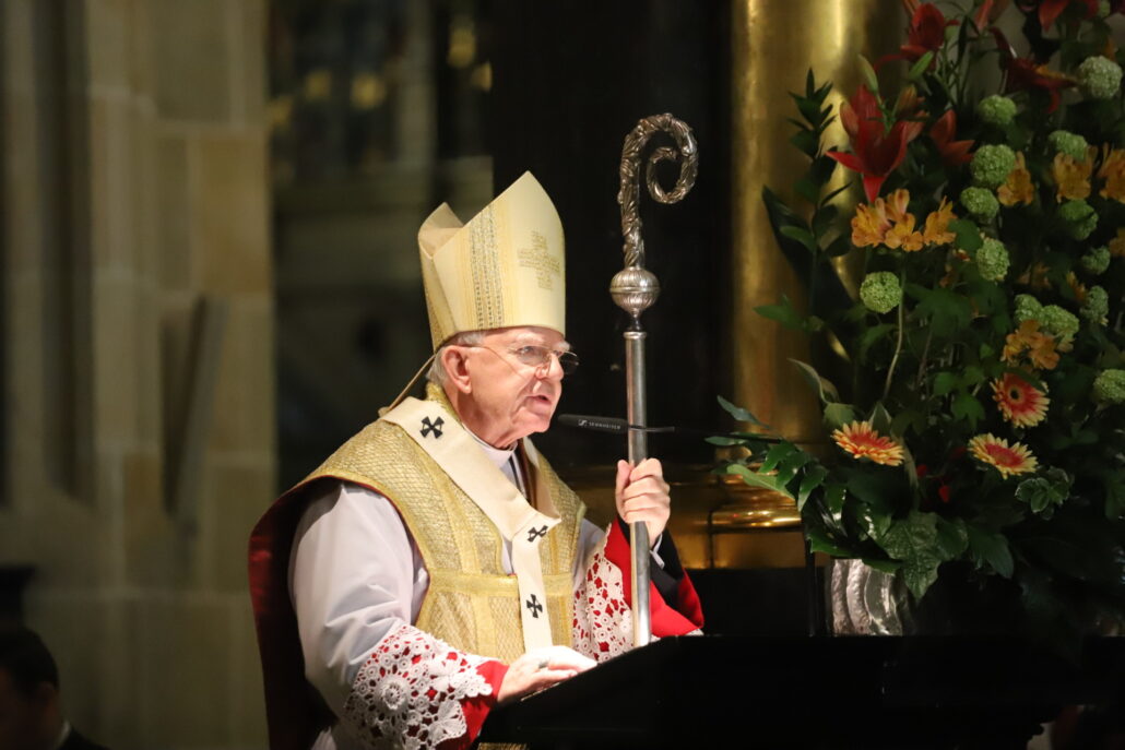Na początku homilii arcybiskup przypomniał słowa Jezusa: „Wytrwajcie w miłości mojej! Jeśli będziecie zachowywać moje przykazania, będziecie trwać w miłości mojej, tak jak Ja zachowałem przykazania Ojca mego i trwam w Jego miłości”. Stwierdził, że wiele lat temu, przystępując do święceń młodzi ludzie usłyszeli ten fragment Ewangelii, w którym pojawiają się słowa o miłości Chrystusa i wezwanie do trwania w Jego miłości. Kolejnego dnia podczas prymicji w seminarium odczytywano Ewangelię, w której Jezus mówił: „Nie wyście Mnie wybrali, ale Ja was wybrałem i przeznaczyłem was na to, abyście szli i owoc przynosili, i by owoc wasz trwał – aby wszystko dał wam Ojciec, o cokolwiek Go poprosicie w imię moje. To wam przykazuję, abyście się wzajemnie miłowali”. We wspomnianym fragmencie Chrystus dawał młodym kapłanom jasne zadanie, by oddali swe życie za Kościół i nazwał ich przyjaciółmi. Zbawiciel przekazał im swe najwyższe tajemnice i objawił wszystko, co usłyszał od Ojca. Wybrał ich i przeznaczył do tego, by przynosili owoc na chwałę Boga i dla zbawienia ludzi.