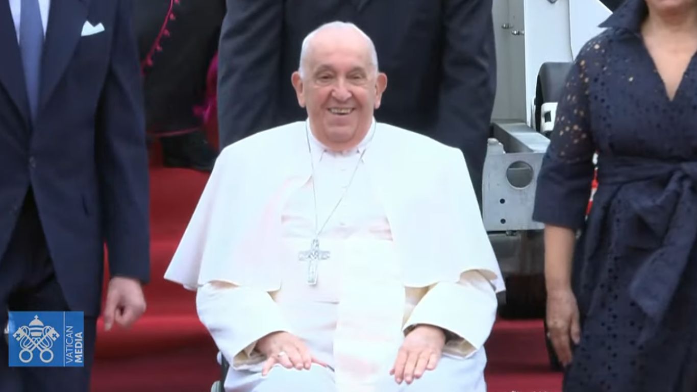 Na płycie lotniska papież Franciszek został przywitany przez wielkiego księcia Luksemburga Henryka wraz z małżonką oraz premiera Luca Friedena. Dwójka młodych ludzi wręczyło papieżowi kwiaty.