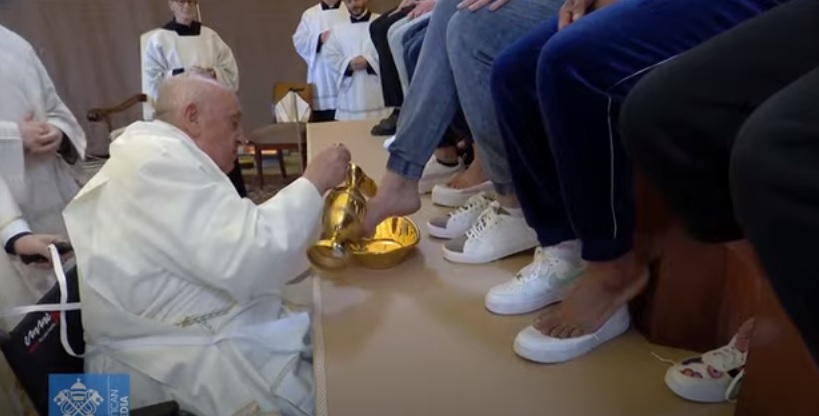 Franciszek wyjaśnił, że poprzez gest umycia stóp zwraca uwagę na powołanie do służby. Prośmy Boga, by sprawił, że wszyscy będziemy wzrastali w powołaniu do służby, zakończył papież, po czym na wózku inwalidzkim podjechał do podwyższenia, na którym siedziało 12 osadzonych kobiet. Symbolicznie umył, wytarł ręcznikiem i ucałował ich stopy.