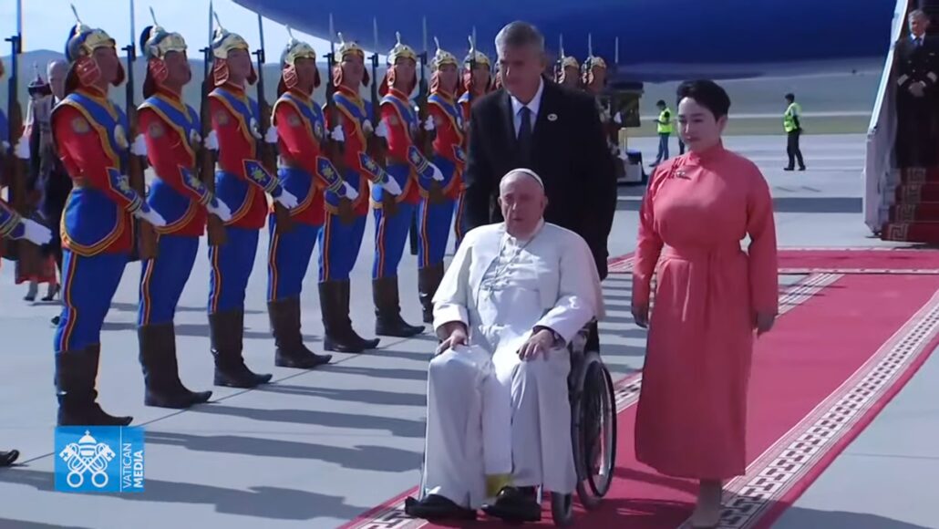 Po wylądowaniu na lotnisku w Ułan Bator, u podnóża schodów samolotu papieża powitała minister spraw zagranicznych, Batmunkh Battsetseg. Wśród witających byli m. in.: prefekt apostolski Ułan Bator kard. Giorgio Marengo, chargé d’affaires nuncjatury apostolskiej w Mongolii, ks. prałat Fernando Duarte Barros Reisa, biskup Ałmaty José Luis Mumbiela Sierra, przewodniczący Konferencji Episkopatu Azji Środkowej i ambasadorka Mongolii przy Stolicy Apostolskiej, Dawaasüren Gerelmaa.