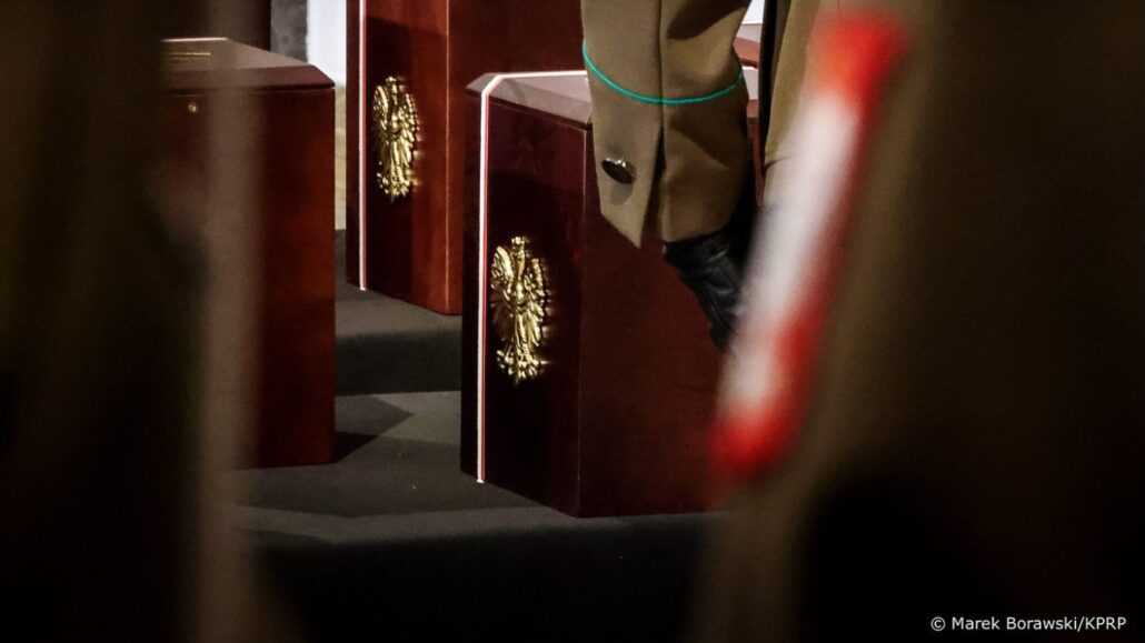 Trumny ze szczątkami ofiar zostały przeniesione przez żołnierzy oraz funkcjonariuszy Straży Granicznej, Służby Więziennej i Policji do krypty katedry polowej. Wieniec od narodu złożył prezydent Karol Nawrocki.