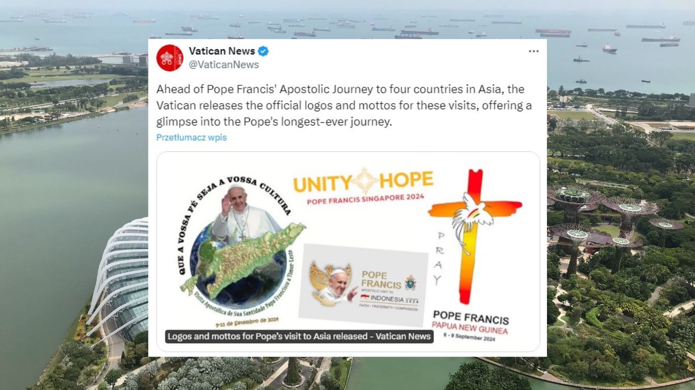 Logo podróży do Singapuru przedstawia stylizowany krzyż inspirowany gwiazdą, która prowadziła Trzech Króli, Eucharystią i pięcioma gwiazdami flagi państwa-miasta. Po lewej i prawej stronie krzyża znajduje się hasło papieskiej wizyty: „Jedność – Nadzieja”. „Jedność” wyraża komunię i harmonię między wierzącymi, zarówno w Kościele, jak i w kontekście społeczeństwa i relacji rodzinnych. „Nadzieja” sugeruje, że podróż apostolska będzie latarnią nadziei dla chrześcijan w regionie, zwłaszcza dla tych, którzy są dyskryminowani i prześladowani. Użyte kolory nawiązują do flagi Państwa Watykańskiego. Pod hasłem znajduje się imię papieża, a obok niego nazwa odwiedzanego kraju i rok wizyty, w kolorze czerwonym na białym tle, w kolorach flagi Singapuru.