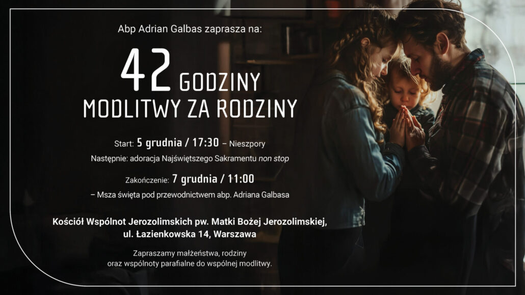 Abp Adrian Galbas zaprasza na maraton modlitewny w intencji rodzin, który odbędzie się w kościele Monastycznych Wspólnot Jerozolimskich przy ul. Łazienkowskiej. Modlitwa rozpocznie się w piątek 5 grudnia, nieszporami o godz. 17:30, a później będzie miała formę nieustannej adoracji Najświętszego Sakramentu, która potrwa również w nocy. Całość zakończy się w niedzielę, 7 grudnia, Mszą Świętą o godz. 11:00, której będzie przewodniczył abp Adrian Galbas.