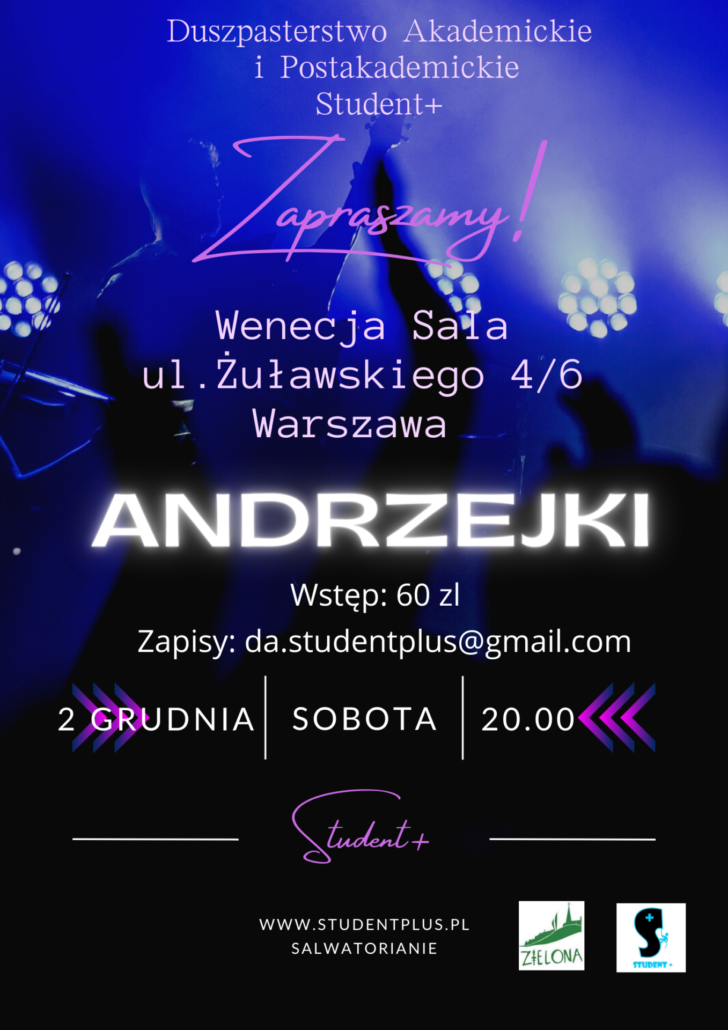 Zapraszamy na imprezę Andrzejkową organizowaną przez Duszpasterstwo Akademickie i Postakademickie STUDENT+, działające przy parafii Salwatorianów NMP Matki Zbawiciela w Warszawie. Skupiamy wokół siebie studentów i absolwentów warszawskich uczelni, którym zależy na rozwoju duchowym oraz poznawaniu nowych ciekawych ludzi, otwartych na chrześcijańskie wartości, którzy potrafią się również dobrze bawić 🙂