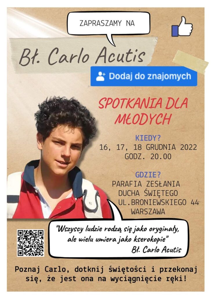 W parafii Zesłania Ducha Świętego, w niedzielę 18 grudnia o godz. 20:00, odbędzie się wprowadzenie relikwii bł. Carla Acutisa. Zanim to nastąpi, w piątek i sobotę młodzi są zaproszeni na spotkania przygotowujące do tego wydarzenia