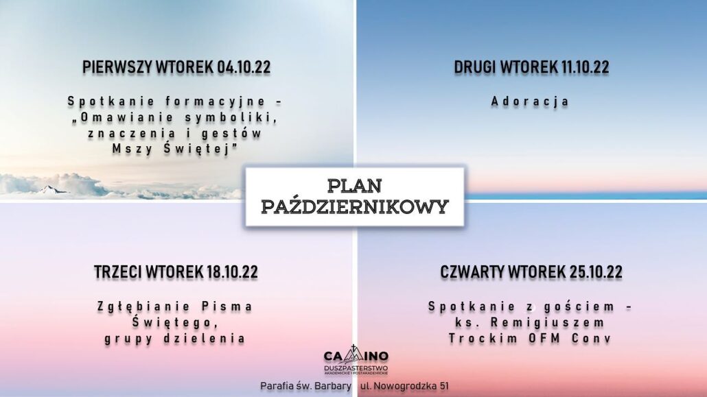 W drugi wtorek października Duszpasterstwo Akademickie i Postakademickie Camino zaprasza na adorację Najświętszego Sakramentu, poprzedzoną Mszą świętą o godz. 18:00