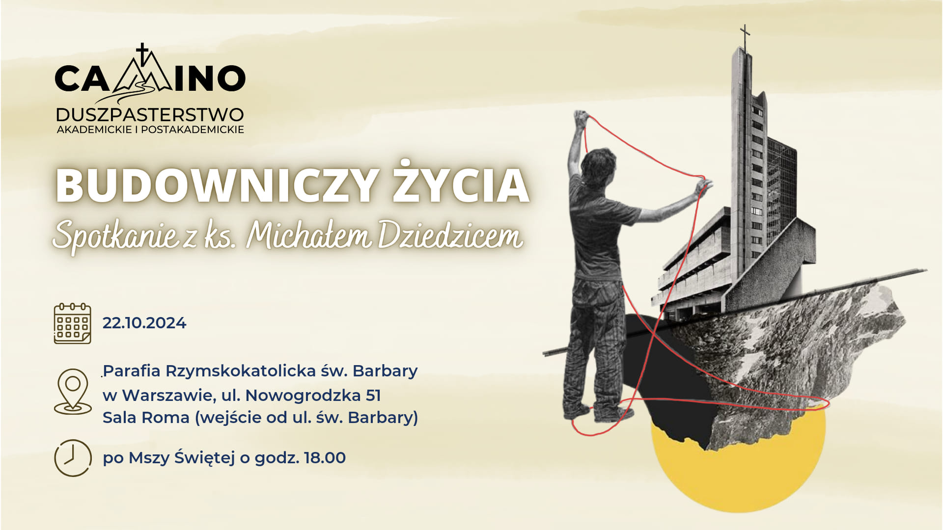 Ksiądz Michał poprowadzi wykład „Budowniczy życia”, który, jak sama nazwa wskazuje, będzie skoncentrowany na budowaniu. Usłyszymy o budowaniu wspólnoty, ale nie tylko!
