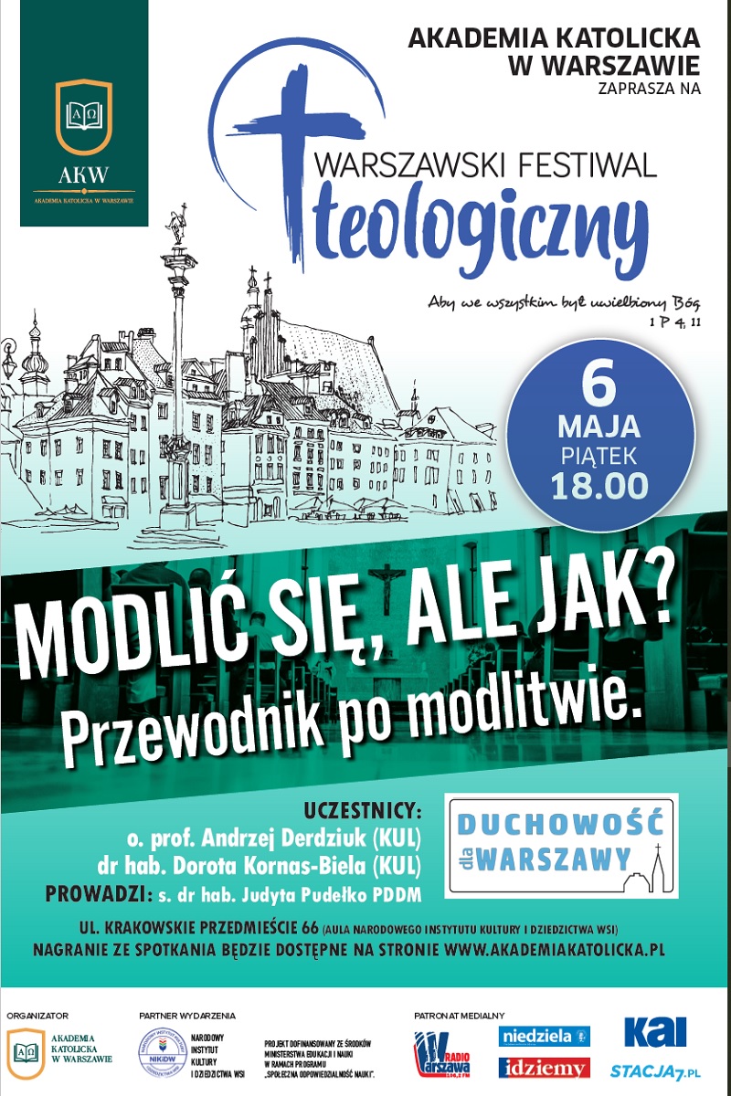 „Modlić się, ale jak? Przewodnik po modlitwie”” to temat wykładu otwartego z cyklu "Duchowość dla Warszawy", jaki wygłoszą: o. prof. Andrzej Derdziuk OFMCap (teolog moralista) oraz dr hab. Dorota Kornas – Biela, prof. KUL (pedagog). Tym razem wykład odbędzie się w ramach Warszawskiego Festiwalu Teologii, organizowanego przez Akademię Katolicką od 6 do 8 maja