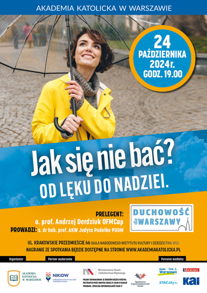 Wobec tych i podobnych pytań staniemy podczas kolejnego wykładu z cyklu „Duchowość dla Warszawy”, organizowanego przez Akademię Katolicką w Warszawie we współpracy z Narodowym Instytutem Kultury i Dziedzictwa Wsi. Wykład zatytułowany „Jak się nie bać? Od lęku do nadziei” wygłosi o. prof. Andrzej Derdziuk OFMCap (Katolicki Uniwersytet Lubelski).