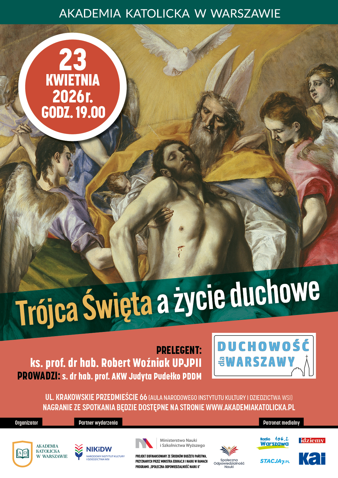 Akademia Katolicka w Warszawie we współpracy z Narodowym Instytutem Kultury i Dziedzictwa Wsi, zaprasza na wykład zatytułowany „Trójca Święta a życie duchowe”, który wygłosi ks. prof. dr hab. Robert Woźniak (UPJPII)