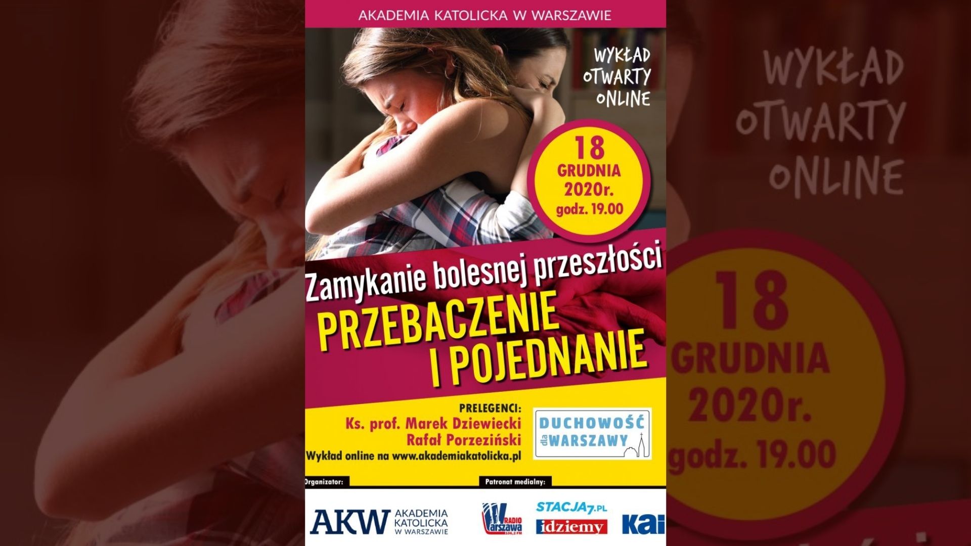 Wykład na temat "Zamykanie bolesnej przeszłości. Przebaczyć i pojednać się" poprowadzą ks. dr Marek Dziewiecki i red. Rafał Porzeziński. Cykl "Duchowość dla Warszawy" organizuje Akademia Katolicka w Warszawie (dawny Papieski Wydział Teologiczny)