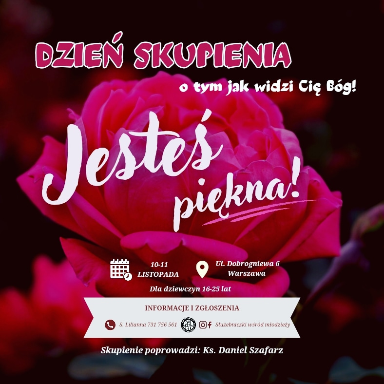 Na dzień skupienia zapraszają siostry służebniczki. Początek w piątek od godz. 18.00, a zakończenie w sobotę 11 listopada godz. 19.30. Skupienie poprowadzi ks. Daniel Szafarz