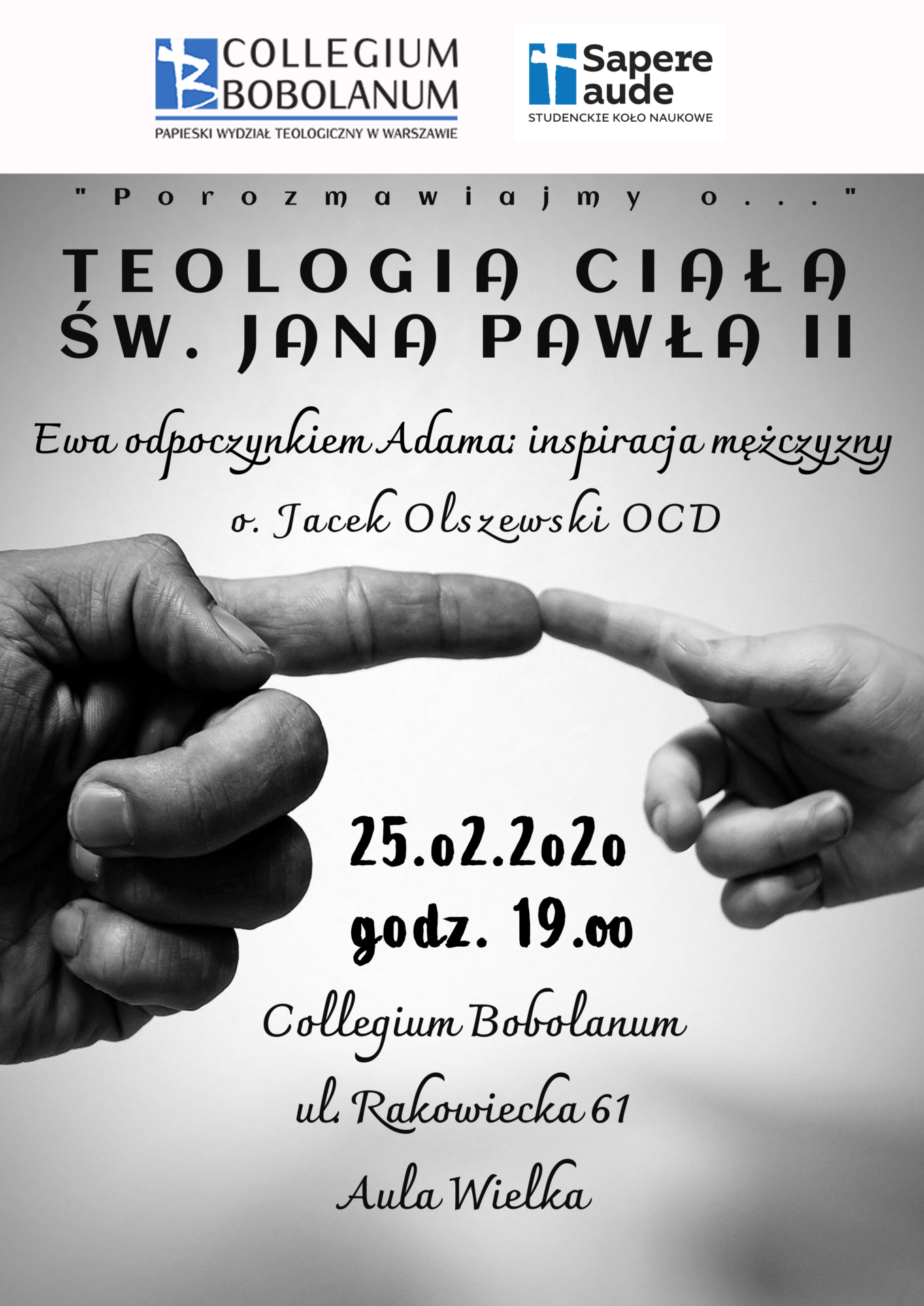 Zapraszamy 25 lutego 2020 we wtorek o godz. 19.00 w Auli Wielkiej Collegium Bobolanum przy Sanktuarium św. Andrzeja Boboli w Warszawie. Spotkanie organizowane jest przez Studenckie Koło Naukowe Sapere aude. Wstęp wolny dla wszystkich, nie tylko studentów!