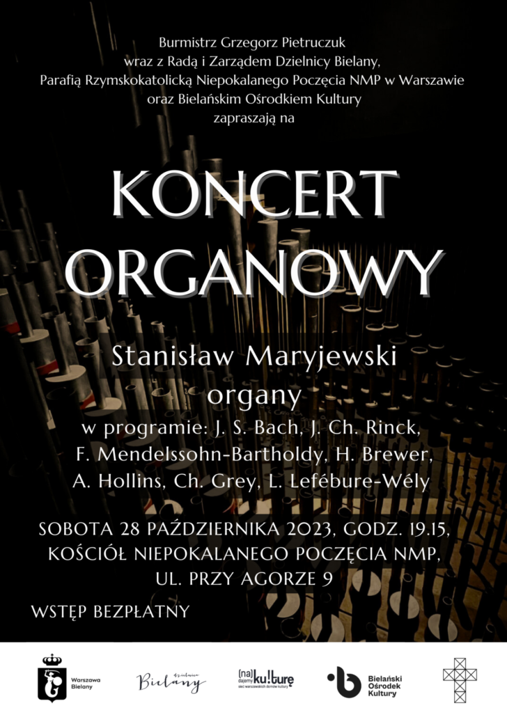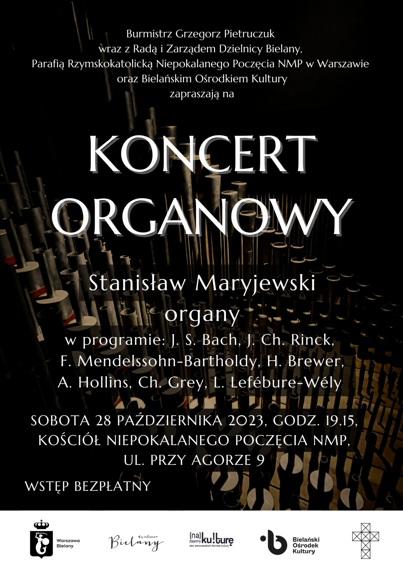 Burmistrz Grzegorz Pietruczuk wraz z Radą i Zarządem Dzielnicy Bielany, Parafią Rzymskokatolicką Niepokalanego Poczęcia NMP w Warszawie oraz Bielańskim Ośrodkiem Kultury zapraszają na koncert organowy.