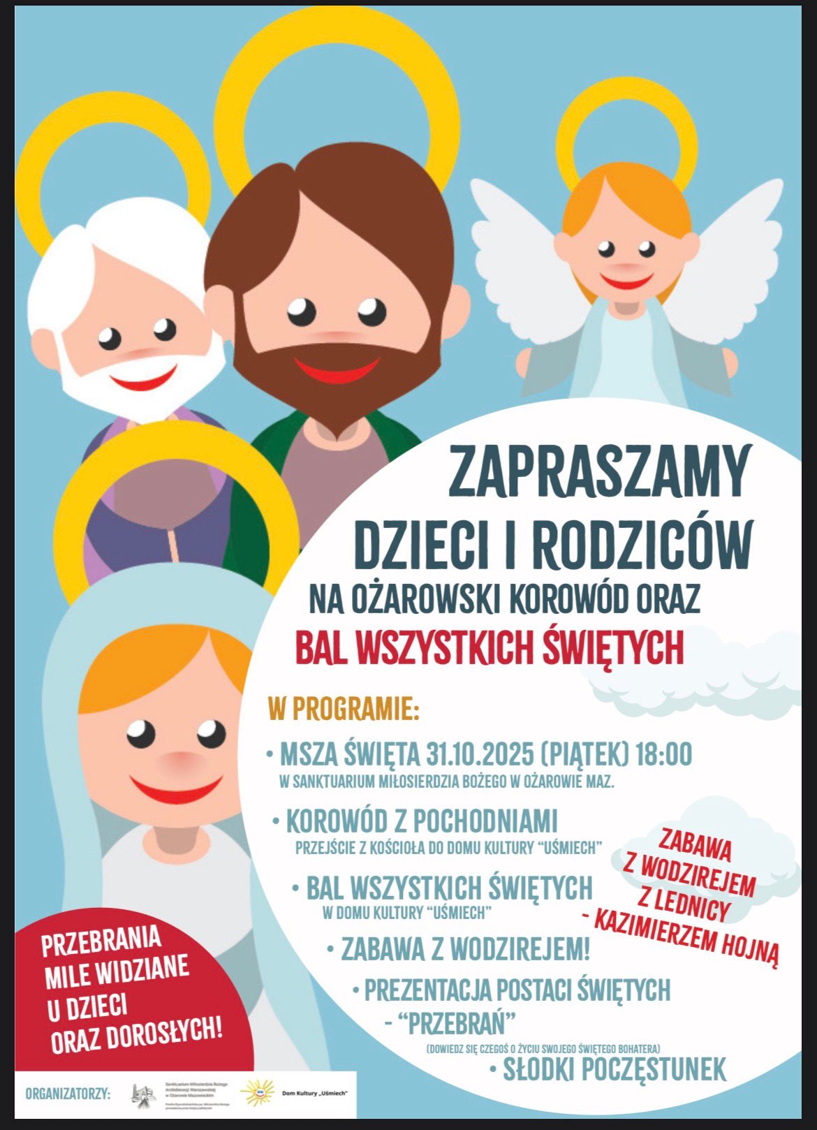 Po Mszy Świętej o godz. 18.00, która odbędzie się w Sanktuarium Miłosierdzia Bożego w Ożarowie Maz. z udziałem dzieci i dorosłych przebranych za ulubionych świętych, kolorowym korowodem przejdziemy do Domu Kultury Uśmiech, gdzie Bal poprowadzi znany wodzirej z Pól Lednickich – Kazimierz Hojna. Zapewniamy radosną atmosferę spotkania ze świętymi oraz słodki poczęstunek.
