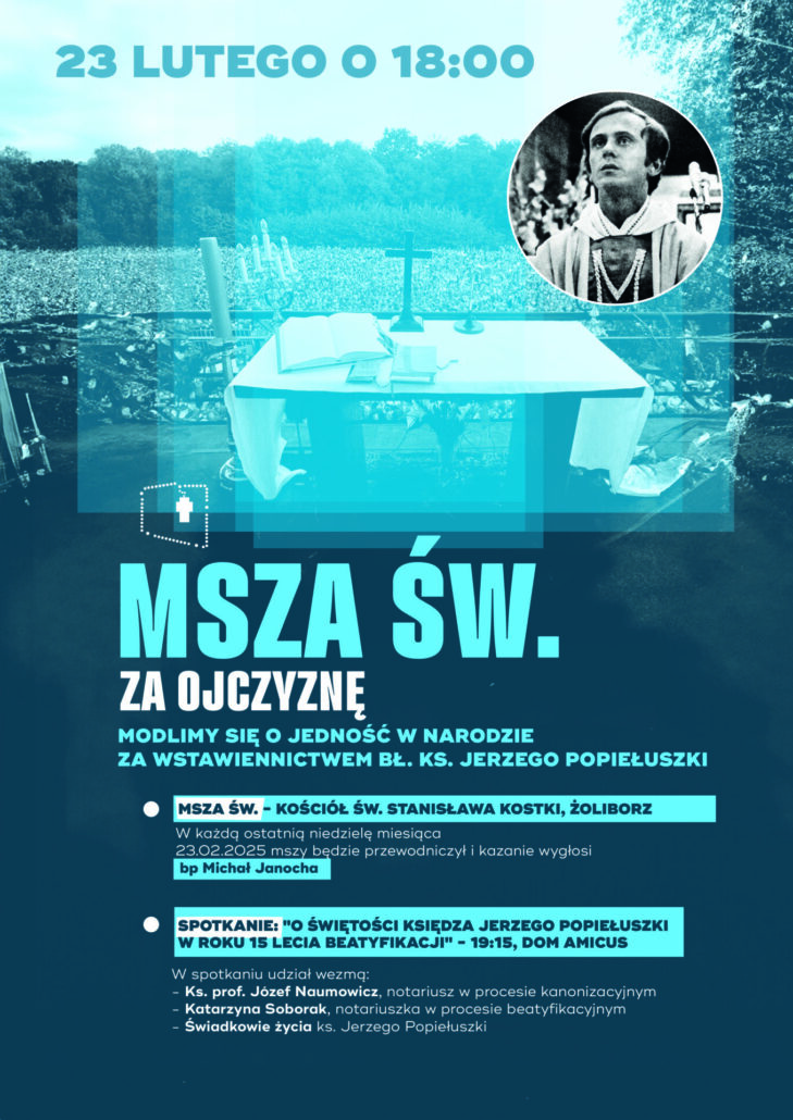 23 lutego, na pamiątkę rocznicy pierwszej Mszy za Ojczyznę, której przewodniczył bł. ks. Jerzy Popiełuszko, liturgii przewodniczył będzie i homilię wygłosi bp Michał Janocha, bp pomocniczy archidiecezji warszawskiej. Po Mszy, w Domu Amicus na terenie parafii odbędzie się spotkanie poświęcone tematowi świętości księdza Jerzego Popiełuszki. Udział w nim wezmą: ks. prof. Józef Naumowicz, notariusz w procesie kanonizacyjnym, Katarzyna Soborak, notariuszka w procesie beatyfikacyjnym i świadkowie życia księdza Popiełuszki.
