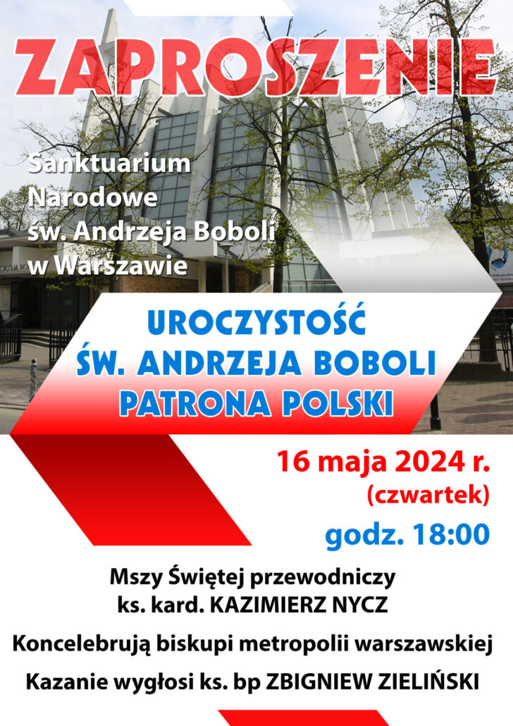 Ojcowie jezuici zapraszają na uroczystości św. Andrzeja Boboli – patrona Polski i Metropolii Warszawskiej - 16 maja 2024 r. (czwartek). Mszy św. koncelebrowanej przez biskupów Metropolii Warszawskiej przewodniczyć będzie kard. Kazimierz Nycz o godz. 18.00 w Sanktuarium św. Andrzeja Boboli na warszawskim Mokotowie