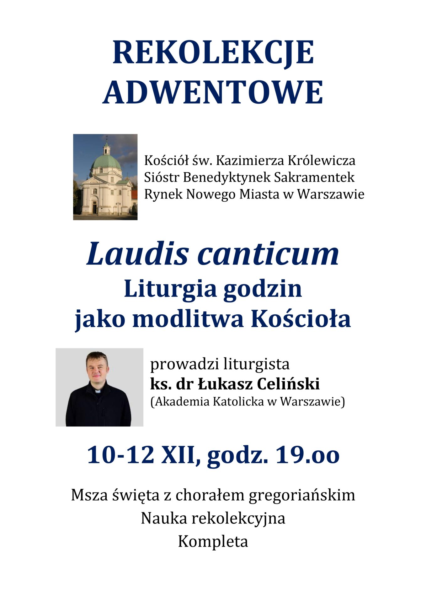 Zapraszamy na rekolekcje adwentowe do Sióstr Benedyktynek Sakramentek na Rynku Nowego Miasta w Warszawie. Prowadzi liturgista ks. dr Łukasz Celiński z Akademii Katolickiej w Warszawie.