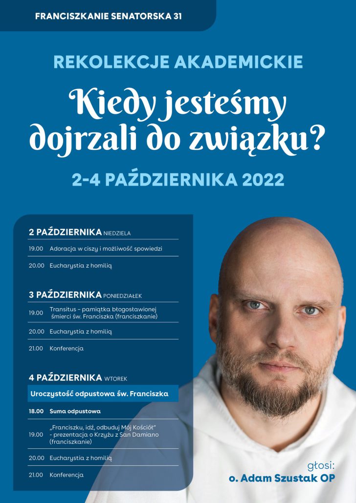 Rekolekcje dla studentów wygłosi o. Adam Szustak OP. Codziennie, od niedzieli 2 października do wtorku 4 października, o godz. 20:00 Msza święta z homilią, a o godz. 21:00 konferencja