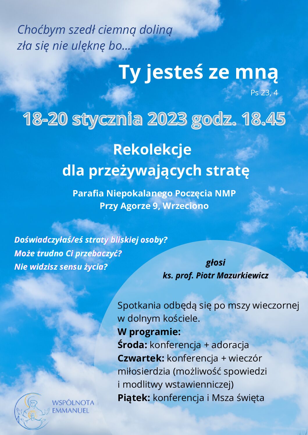 Rekolekcje dla osób przeżywających stratę/żałobę, tracących nadzieję. Spotkania odbędą się w dniach 18 – 20 stycznia 2023 w Parafii Niepokalanego Poczęcia w Warszawie, na Wrzecionie, ul. Przy Agorze 9 (dolny kościół); rozpoczęcie godzina 18.45. Rekolekcje głosi ks. Piotr Mazurkiewicz ze Wspólnoty Emmanuel. W programie: