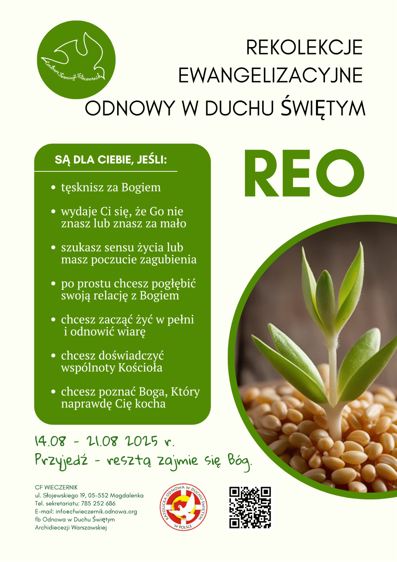 Rekolekcje, które prowadzą do odkrycia i pogłębienia relacji z Bogiem. Pomagają zrozumieć czym jest chrześcijaństwo, zaprzyjaźnić się z Pismem Świętym, odkryć nieskończoną miłość Boga. Nie ważne, czy wydaje ci się, że gdzieś się zagubiłeś, czy czujesz, że Twoja wiara jest letnia, czy też wydaje Ci się, że wiesz już wszystko. REO zmieniają sposób myślenia i patrzenia na wiarę, wlewają w życie nadzieję i radość.