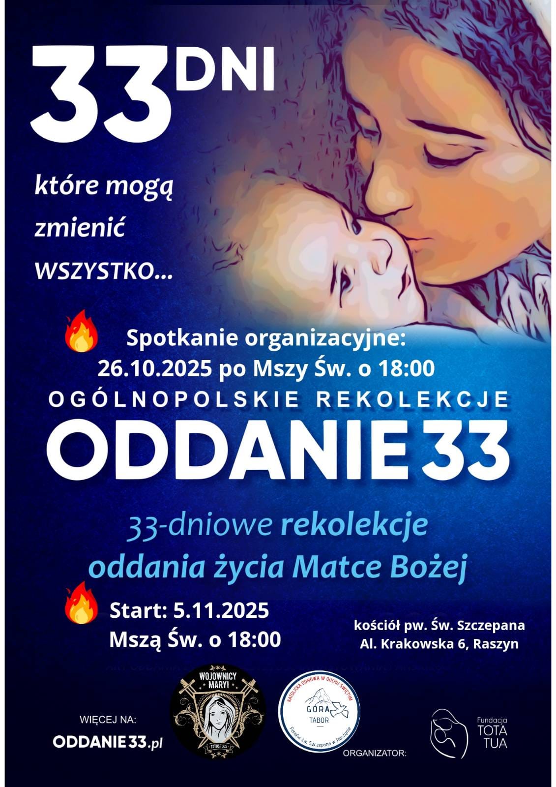 Wspólnota Odnowy w Duchu Świętym oraz Wojownicy Maryi w parafii św. Szczepana w Raszynie zapraszają do wzięcia udziału w 33-dniowych rekolekcjach. Spotkanie organizacyjne dla chętnych odbędzie się w niedzielę, 26. października, po Mszy świętej o godzinie 18:00 w kościele parafialnym, w Raszynie