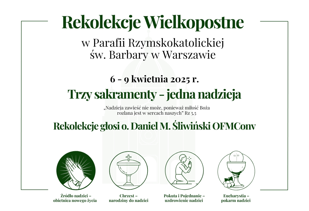 Rekolekcje wielkopostne w parafii św. Barbary będą poświęcone sakramentom, które umacniają naszą wiarę i nadzieję. Każdy dzień będzie poświęcony innemu aspektowi chrześcijańskiego życia sakramentalnego: