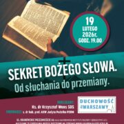 Akademia Katolicka w Warszawie we współpracy z Narodowym Instytutem Kultury i Dziedzictwa Wsi, zaprasza na wykład z cyklu ,,Duchowość dla Warszawy” zatytułowany „Sekret Bożego Słowa. Od słuchania do przemiany”, który wygłosi ks. dr Krzysztof Wons SDS, dyrektor Centrum Formacji Duchowej w Krakowie