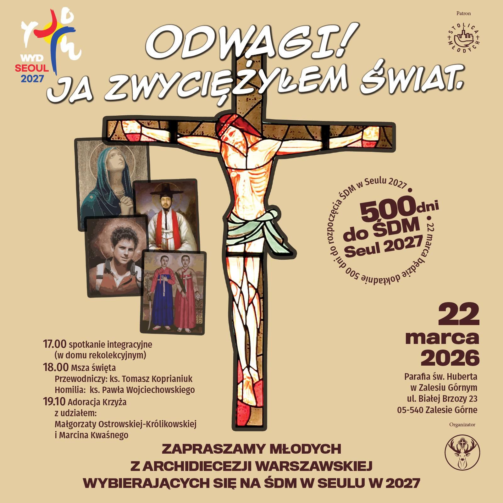 22 marca 2026 będzie dokładnie 500 dni do Światowych Dni Młodzieży w Seulu w 2027 pod tytułem „Odwagi! Ja zwyciężyłem świat.” W związku z tym zapraszamy młodych, którzy zamierzają na nie pojechać na pierwsze z cyklu spotkań przygotowujących do wyjazdu na ŚDM organizowane pod patronatem Stolicy Młodych