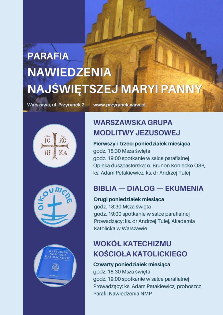 Spotkania odbywają się w drugi poniedziałek miesiąca. O godz. 18:30 Msza Święta a po niej, o godz. 19:00 spotkanie w salce parafialnej, prowadzone przez ks. Andrzeja Tuleja