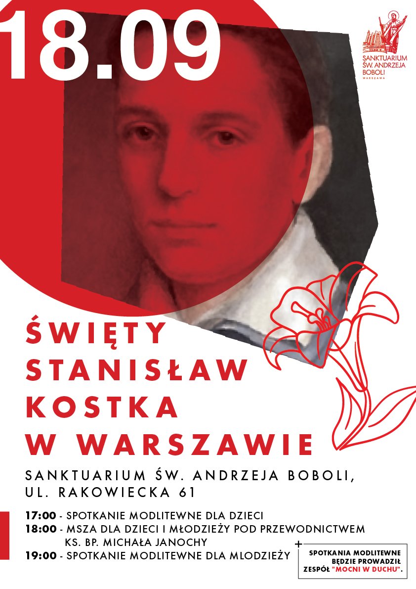 Spotkanie ze św. Stanisławem Kostką rozpocznie się nabożeństwem dla dzieci o godzinie 17.00, po którym o godzinie 18.00 będzie sprawowana Msza święta pod przewodnictwem bp. Michała Janochy. Po mszy będzie czas radosnego uwielbienia przygotowanego dla młodzieży. Wszystkie nabożeństwa będzie prowadził zespół „Mocni w Duchu” wraz z młodymi ludźmi ze wspólnoty „Młodość – lubię to!”.