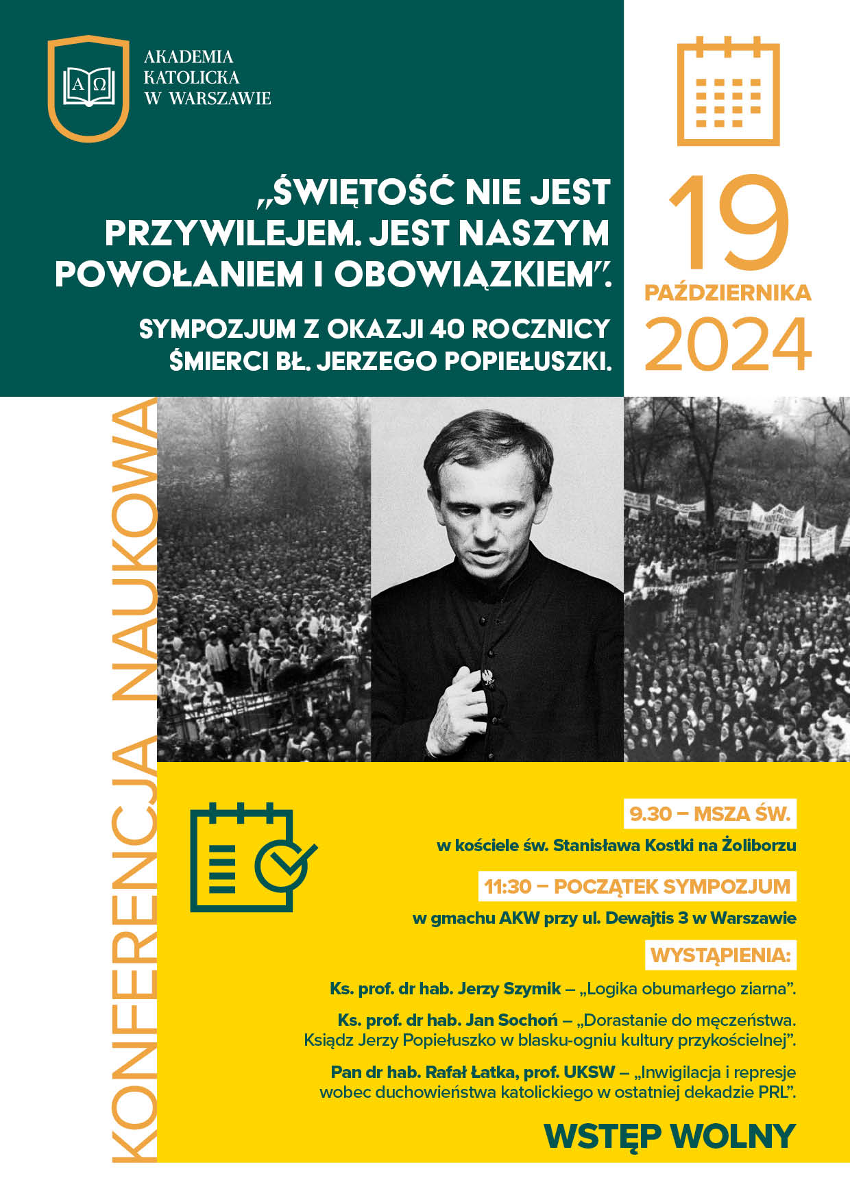 Akademia Katolicka w Warszawie zaprasza na sympozjum z okazji 40. rocznicy śmierci bł. Jerzego Popiełuszki: „Świętość nie jest przywilejem. Jest naszym powołaniem i obowiązkiem”, które odbędzie się w sobotę 19 października