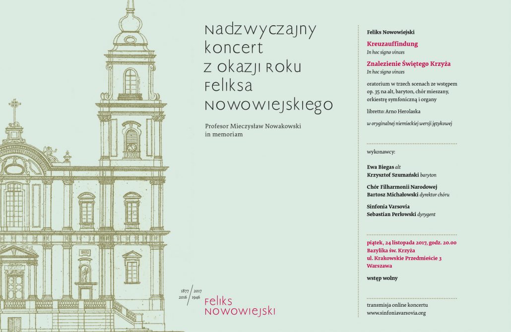 Monumentalne oratorium Feliksa Nowowiejskiego „Znalezienie Świętego Krzyża” zabrzmi na nadzwyczajnym koncercie z okazji Roku Feliksa Nowowiejskiego „Profesor Mieczysław Nowakowski in memoriam”. Orkiestrę Sinfonia Varsovia, Chór Filharmonii Narodowej oraz solistów poprowadzi Sebastian Perłowski. Koncert będzie transmitowany online.