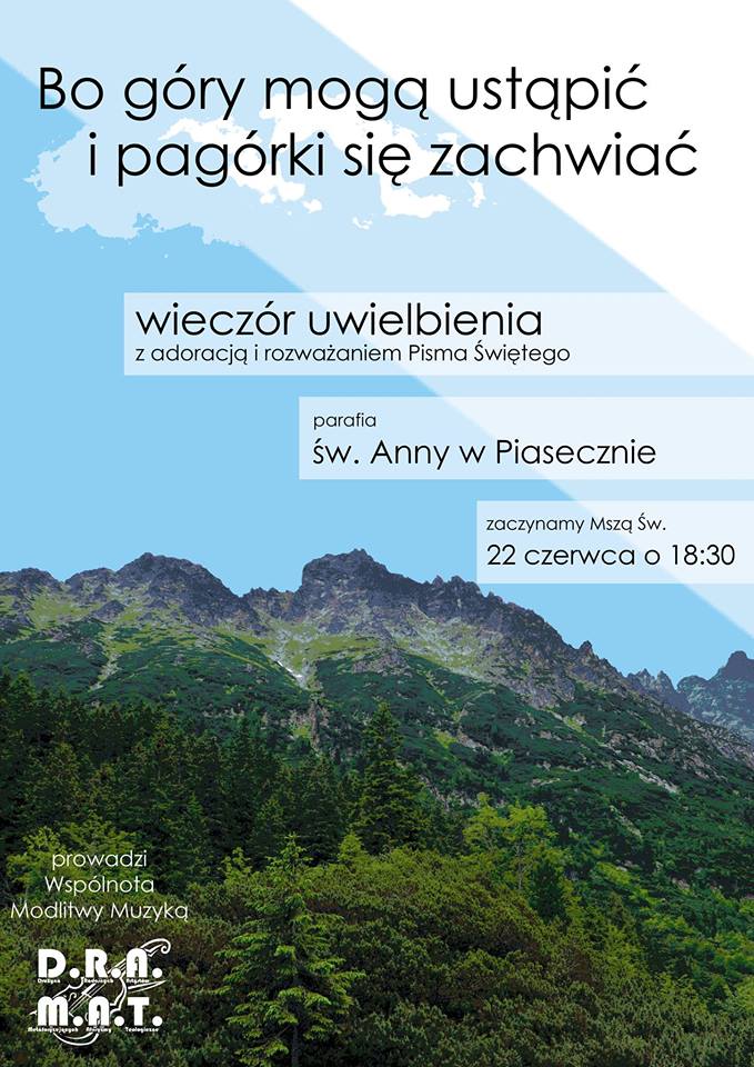 Wspólnota Modlitwy Muzyką "D.R.A.M.A.T." zaprasza na kolejny już Wieczór Uwielbienia, tym razem pod hasłem: "Bo góry mogą ustąpić i pagórki się zachwiać"