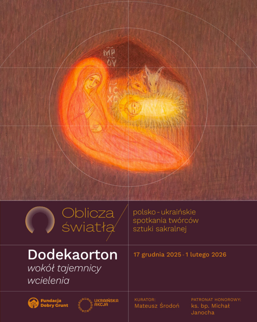 Już po raz czwarty od wybuchu pełnoskalowej wojny na Ukrainie grupa polskich i ukraińskich artystów spotkała się w gościnnym domu państwa Marii i Mateusza Środoniów w Łuczanowicach. Wspólnie modlili się o pokój i pracowali nad wielkimi tematami sztuki chrześcijańskiej: w Tradycji Zachodniej zebranymi w cykl Tajemnic Różańca Świętego, a w Tradycji Wschodniej w Dodekaorton – zespół dwunastu wielkich świąt roku liturgicznego. Prezentowane prace obejmują trzy tematy związane z Tajemnicą Wcielenia, w której Bóg objawia swą Miłość: Zwiastowanie, Nawiedzenie św. Elżbiety i Narodzenie Pana Jezusa.