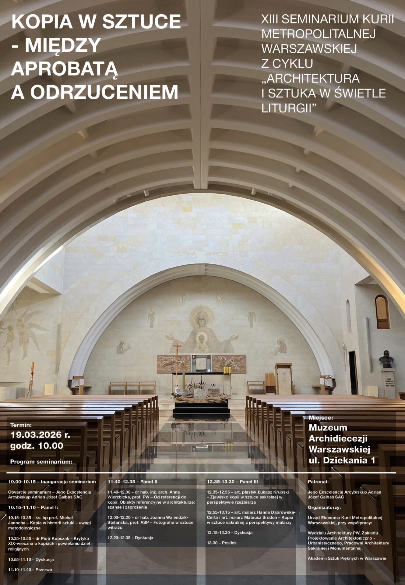zapraszam na XIII Seminarium z cyklu „Architektura i sztuka w świetle liturgii” na temat: Kopia w sztuce – między aprobatą a odrzuceniem, które odbędzie się 19 marca 2026 r. w godzinach 10.00-14.00 w Muzeum Archidiecezji Warszawskiej przy ul. Dziekania 1.