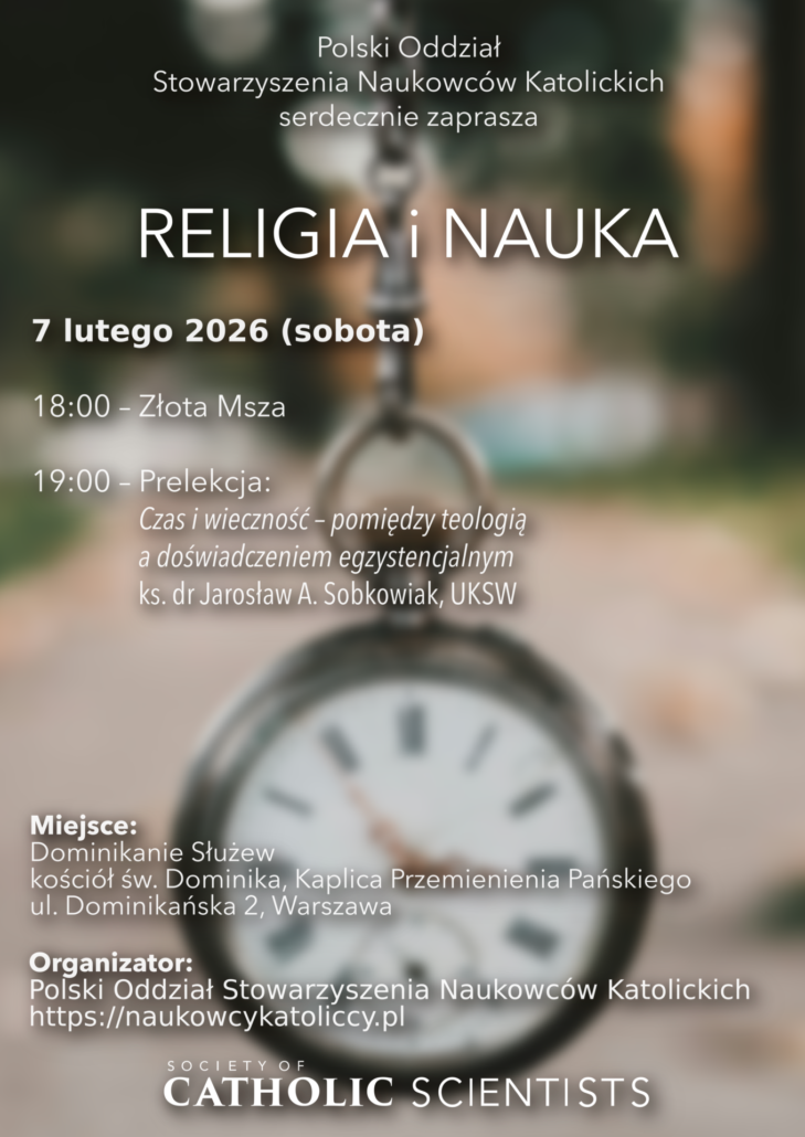Polski Oddział Stowarzyszenia Naukowców Katolickich zaprasza na Mszę Świętą i prelekcję pt. „Czas i wieczność-pomiędzy teologią a doświadczeniem egzystencjalnym”, którą wygłosi ks. dr Jarosław A. Sobkowiak, UKSW